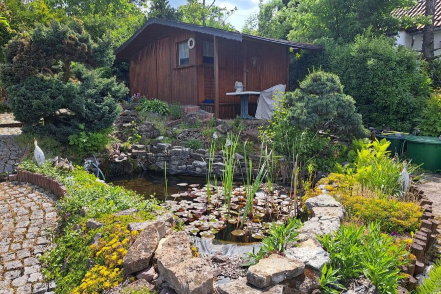 Auf dem Grundstück befinden sich 2 Häuser und ein Teich.