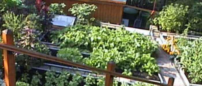 mehrere terrassierte Beete und Pflanzbereiche (u. a. mit 4 Europaletten-Hochbeeten)